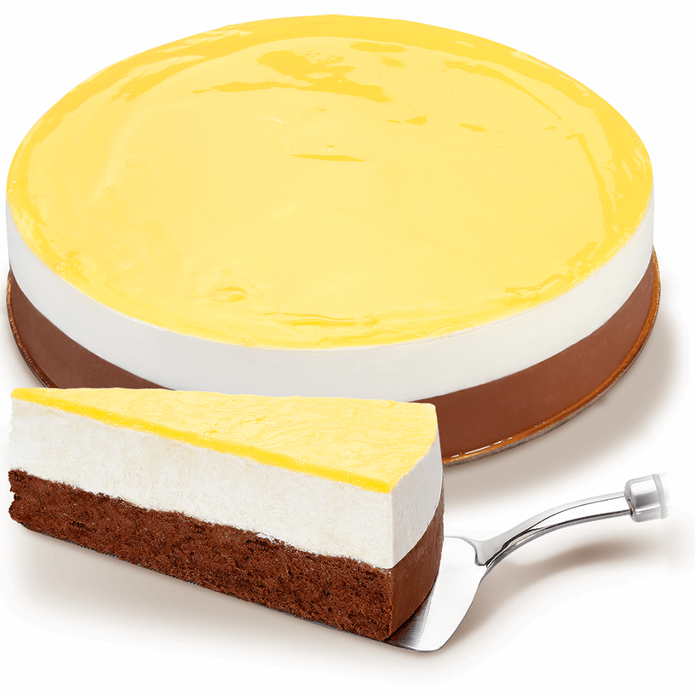 Chocoladebiscuit gevuld met chocolademousse, vanilleroom en bedekt met vanilleglazuur.